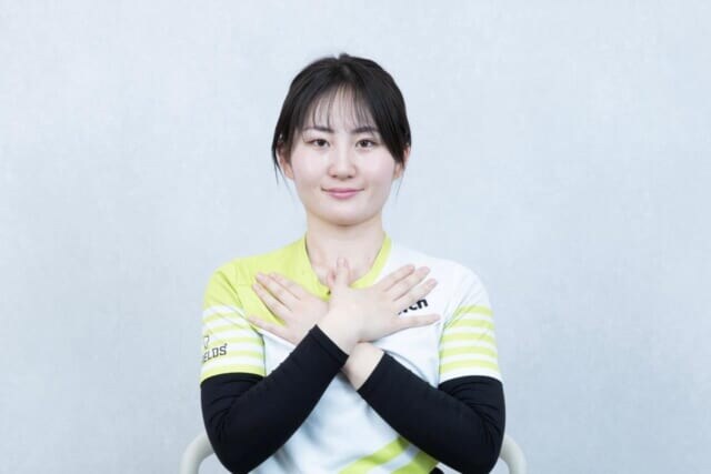 (1)骨盤を立てて座り、両手を胸の前でクロスするように置く