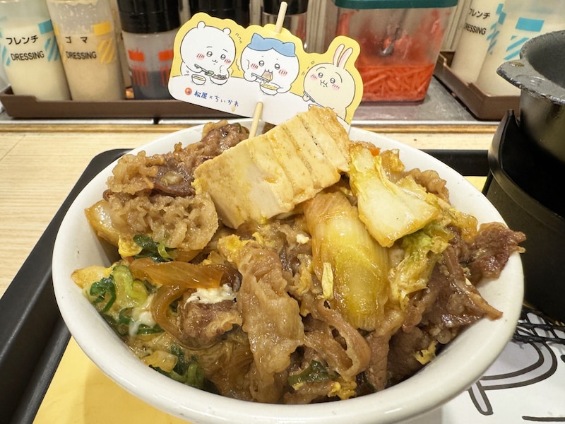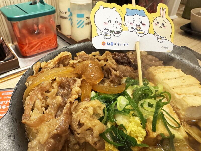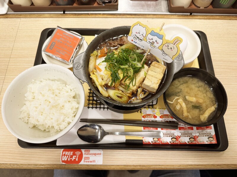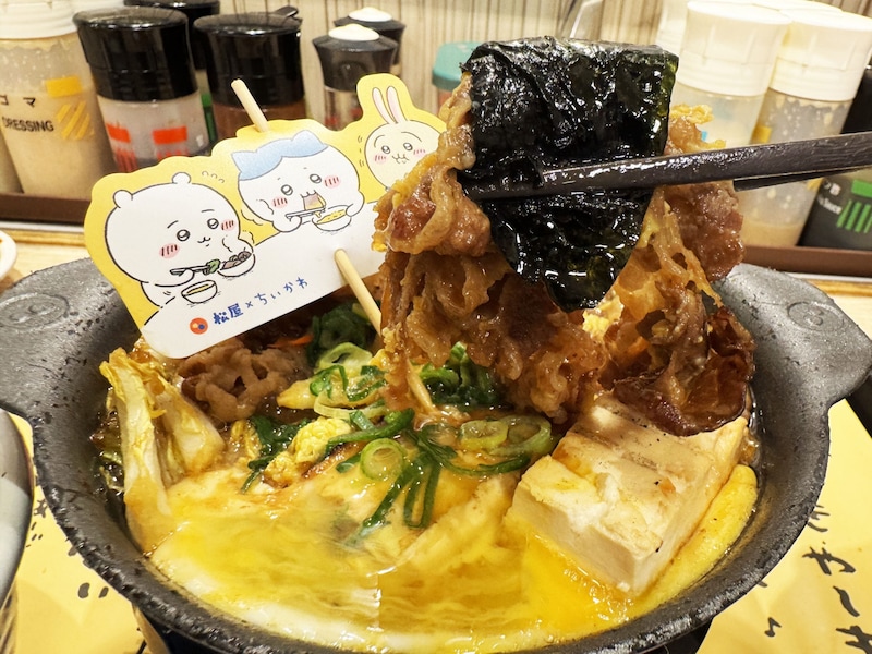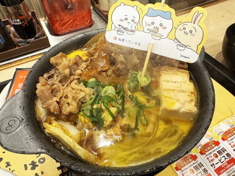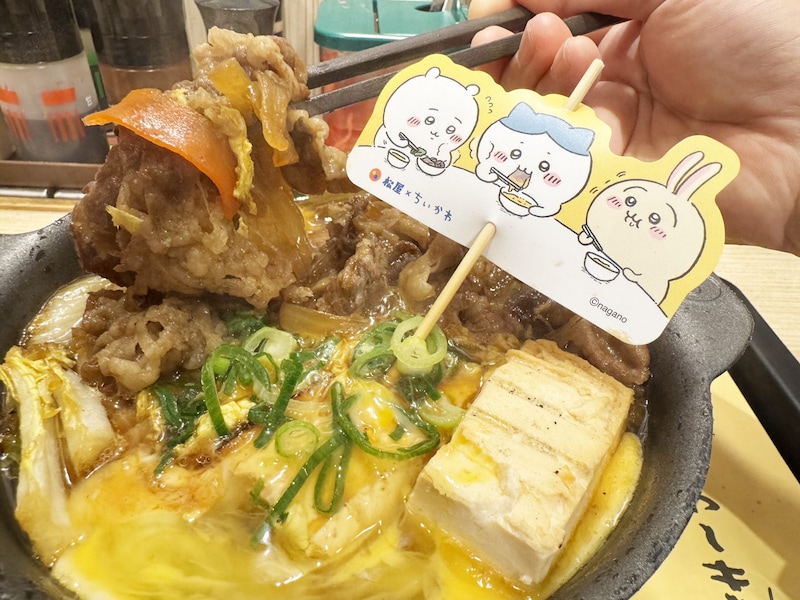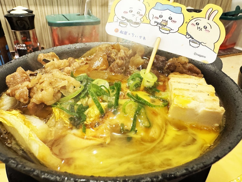 松屋の「ちいかわのすき焼き鍋膳」は甘味と牛肉エキスの旨味が魅力。