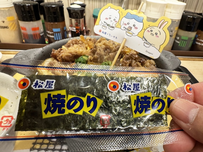 海苔で「ちいかわのすき焼き鍋膳」の具を包むようにして食べるの。