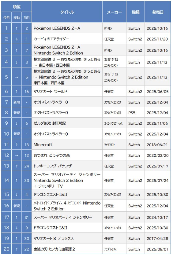 また、Switch2『マリオカート ワールド』をはじめとする多人数向けタイトルも順位を上げており、本体との同時購入や贈り物として選ばれる傾向が見られました。クリスマス時期のプレゼント需要とハードウェアの普及が、市場を大きく牽引した一カ月となりました。