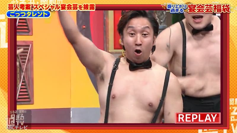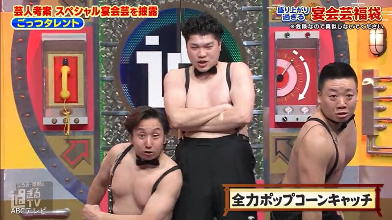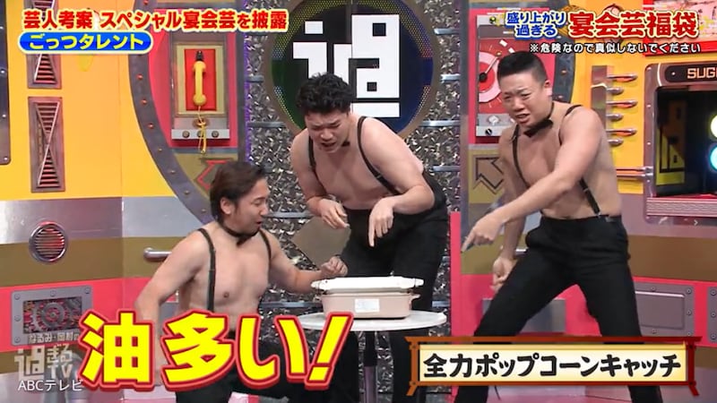 そんなごっつタレントの面々は、上半⾝裸に、黒のスラックス、サスペンダーベルト、蝶ネクタイという変態チックな姿で、岡村となるみの前に登場! はじけ⾶ぶポップコーンを⼝でキャッチする、“全力ポップコーンキャッチ芸”に挑んだ。この芸はかなり危険なため、「誰か1人でもキャッチできたら成功」という甘めなルールだ。