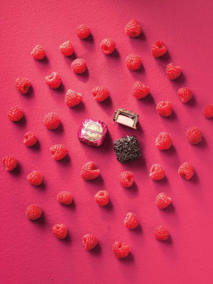 新作「チョコビアラズベリー」は、濃厚なラズベリーフィリングとソースを重ね、ダークチョコレートシェルで包みチョコビア75%グレインをまとわせた一粒。