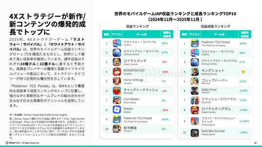2025年、4Xストラテジーゲーム『ラストウォー:サバイバル』と『ホワイトアウト・サバイバル』は、世界のモバイルゲーム収益ランキングのトップ2を確固たるものとし、依然として極めて高い成長率を維持しています。通年収益はそれぞれ24億ドルと22億ドルに達すると予測され、高課金プレイヤーの獲得と長期ライフサイクルバリューの創出において、ストラテジーカテゴリーが持つ圧倒的な優位性を示しています。