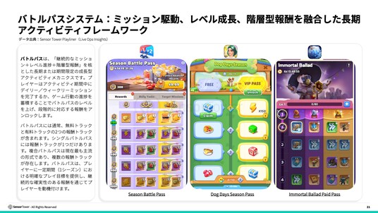 バトルパスは、「継続的なミッション+レベル進捗+階層型報酬」を核とした長期または期間限定の成長型アクティビティメカニクスです。プレイヤーはアクティビティ期間中にデイリー/ウィークリーミッションを完了するか、ゲーム行動の進捗を蓄積することでバトルパスのレベルを上げ、段階的に対応する報酬をアンロックします。バトルパスは、プレイヤーに明確な目標感と方向性を提供し、プレイヤーの継続率を大幅に向上させます。