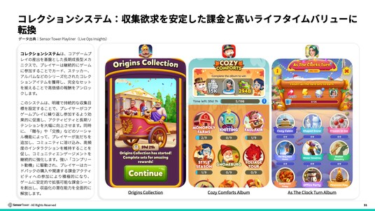 コレクションシステムは、コアゲームプレイの産出を基盤とした長期成長型メカニクスで、プレイヤーは継続的にゲームに参加することでカード、ステッカー、アルバムなどのシリーズ化されたコレクションアイテムを獲得し、完全なセットを揃えることで高価値の報酬をアンロックします。このシステムは、明確で持続的な収集目標を設定することで、プレイヤーがコアゲームプレイに繰り返し参加するよう効果的に促進し、アクティビティと長期リテンションを大幅に向上させます。強い「コンプリート動機」に駆動され、プレイヤーはカードパックの購入や関連する課金アクティビティへの参加により積極的になり、ゲームに安定的で拡張可能な課金シーンを創出し、収益化の潜在能力を全面的に解放します。