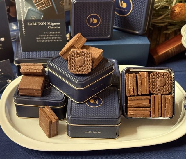 さらに「ミルフィーユ マロン」「エクレア ショコラ」、「サバラン エキゾチック」や、ひと回りコンパクトなクッキー缶「ザブトン ミニョン ショコラ」も販売。