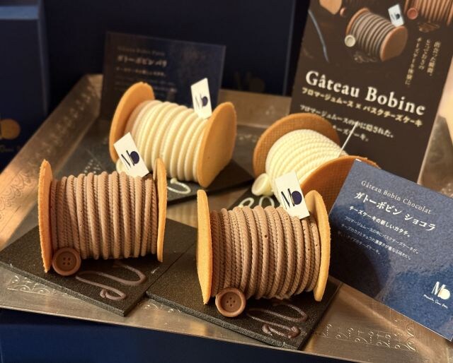 新作ケーキは、ボビンをデザインした「ガトー ボビン パリ」と「ガトー ボビン ショコラ」が登場。フロマージュムースの中に、濃厚なバスクチーズケーキが入っています。