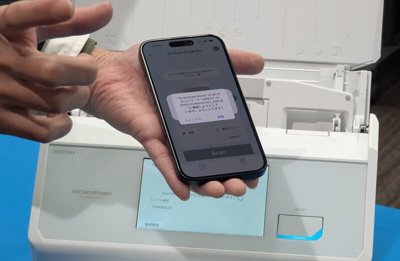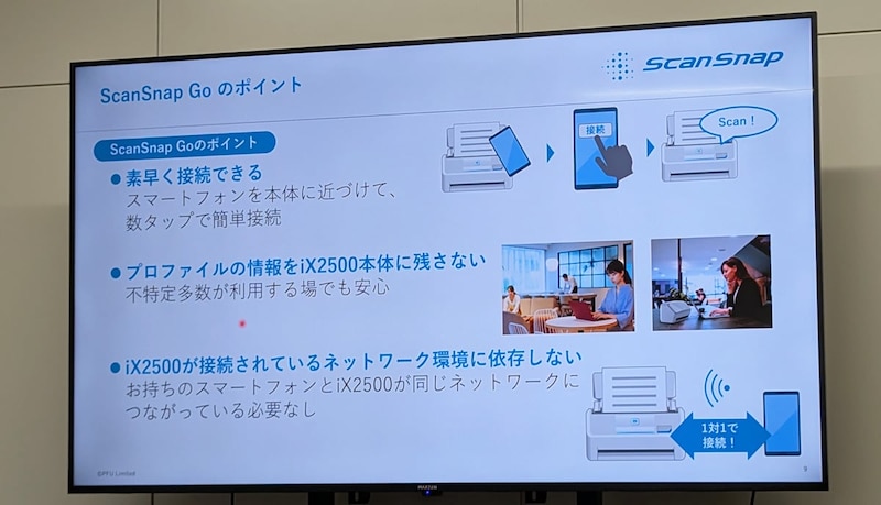 PFUは1月8日、紙や写真をスキャンしてPCやスマホに保存したり、連携するクラウドサービスにアップロードできるイメージスキャナ「ScanSnap」シリーズのフラッグシップモデル「ScanSnap iX2500」向けに、新機能「ScaSnap Go」の提供を開始しました。スマホアプリ「ScanSnap Home」をインストールしたスマホをスキャナ本体に近づけることで、簡単に本体とスマホを1対1でWi-Fi接続できる機能。フリーアドレスのオフィスやコワーキングスペースに設置したスキャナを利用したり、自宅に設置したスキャナを家族で共用するなどの用途を想定しています。