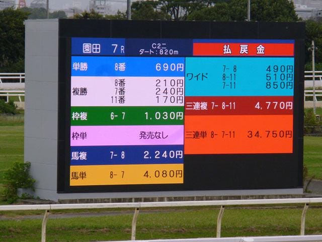 2レースほど見(ケン)して、第7Rから勝負開始。予想紙でその日当ててたのは、第5Rの無印2着馬にただ一人◎をつけた宮垣記者。7R、彼の対抗⑩と人気薄△⑦⑧をボックス3点買いすると、おお! ⑧が大逃げ、ゴール直前で2番人気の⑪を6番人気の⑦がかわして馬複⑧⑦で的中!!