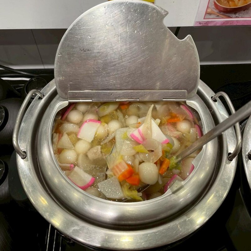 かまぼこ、大根、人参、長ねぎ、お雑煮としては珍しい白玉など、鍋の中には具材がたっぷり。お玉ひとすくいで、見ても食べても満足度の高い内容です。