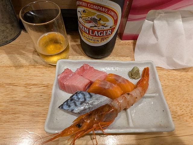 ここでは従業員も20代の美人の女子なのでオッサンがひしめくのは仕方ない。おすすめのつまみは「おつくり盛り合わせ」600円。分厚い本マグロに、サーモンに、シメ鯖に、赤エビが1本。ヒエ〜、こりゃ天国じゃ、ア〜メマ〜。