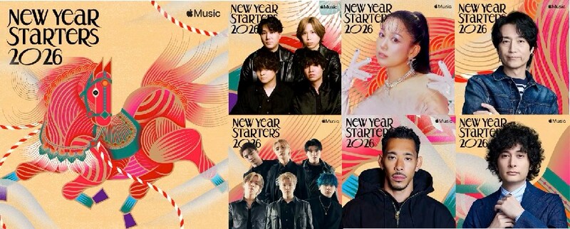 Apple Musicではプレイリストコレクション「New Year Starters 2026」を公開。Official髭男dism、BE:FIRST、西野カナ、IOの4組がキュレーションする音楽が並ぶ。