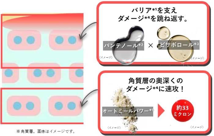 角質上層部にはパンテノール²とビサボロール³がバリア機能¹をサポートし、外的刺激⁴から肌を保護。下層部にはオートミールパワー⁵が働きかけ、ダメージ⁴を集中ケアします。
