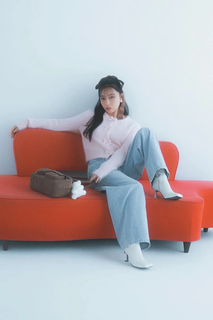 カーディガン 11,000円/ MOUSSY(バロックジャパンリミテッド)カーブデニムパンツ 14,960円/JILL by JILL STUART ルミネエスト新宿店 ネックレス 4,510円/Linola(805showroom)イヤリング 25,300円/アビステ バッグ 3,959円 / WEGO バッグにつけたチャーム 4,510円/much and ebony(HANA KOREA)ショートブーツ 3,990円/神戸レタス リボン/スタイリスト私物