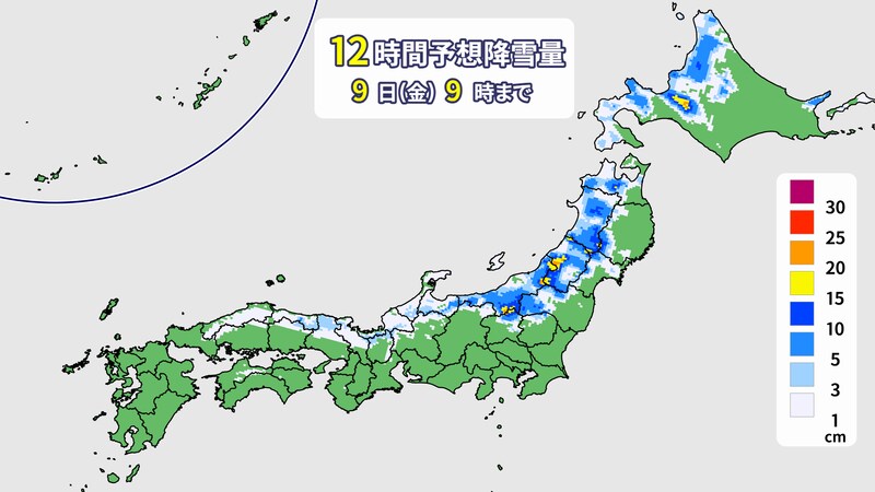 1月8日(木)の夜も冬型の気圧配置、寒気の影響が続きますので、1月9日(金)の朝にかけてある程度、新雪が積もるでしょう。日中は高気圧が張り出してくるため、雪は次第に止むでしょう。晴れ間の出る所もある見込みです。