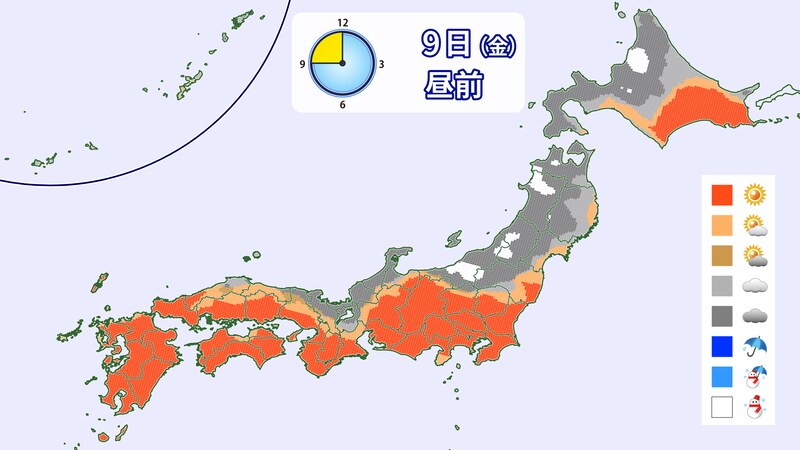 近畿北部や山陰はさらった雪の積もる所がありそうです。1月9日(金)は晴れる所が多いでしょう。