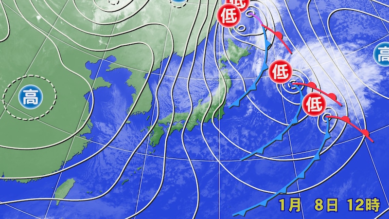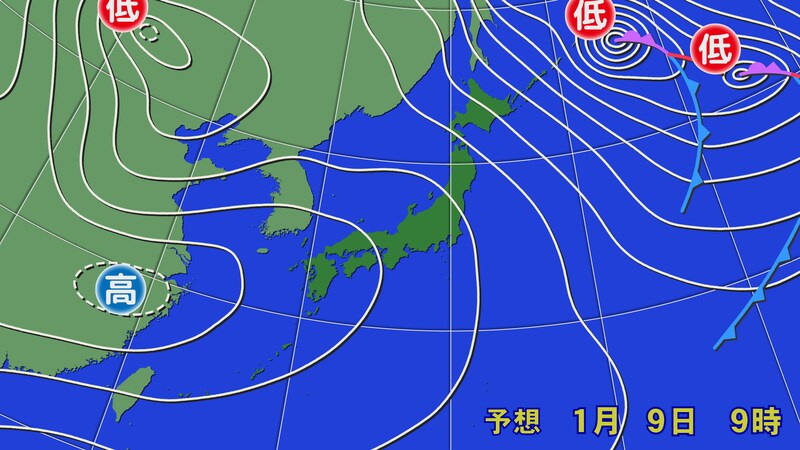 日本付近は冬型の気圧配置となっています。日本海側は山沿いを中心に雪や吹雪となっていて、1月9日(金)の朝にかけて日本海側は新雪が期待できそうです。日中は移動性高気圧によって次第に雪は止むでしょう。