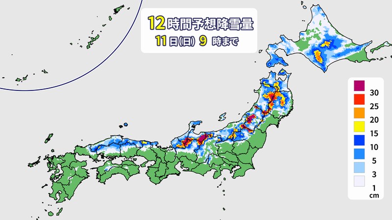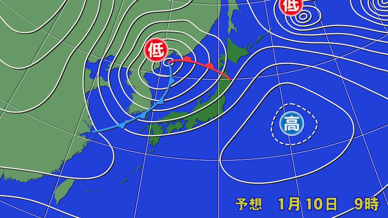 発達した低気圧は沿海州へと進み、寒冷前線を通過して日本付近は強い冬型の気圧配置となるでしょう。1月11日(日)へと日付が変わる頃までは雨の所が多いですが、朝には全国的に雪に変わる見込みです。