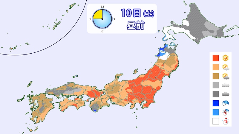 1月10日(土)の日中はおおむね晴れるでしょう。西日本では南寄りの風が強く吹く見込みです。リフトの運行状況など注意してください。