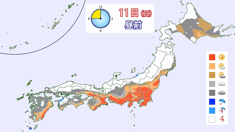 1月11日(日)は、九州や太平洋側のエリアも含め雪が降るでしょう。風も強いため、オープンできないゲレンデもあるかもしれません。また、道路情報などもよく確認して、事故や交通障害などに巻き込まれないようご注意ください。