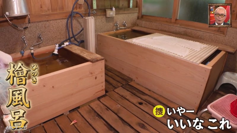 隠居して10年。夫婦の楽しみは、毎日ここのお風呂に一緒に入ること。「薪はいくらでもある」と、仕事で出た大型の薪で沸かす巨大なボイラーに、朝7時半から火を点ける。自分の山の木で作った檜風呂に1日2回入るのが日課となっている。