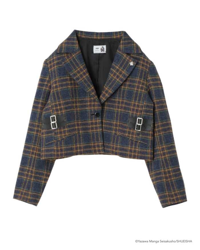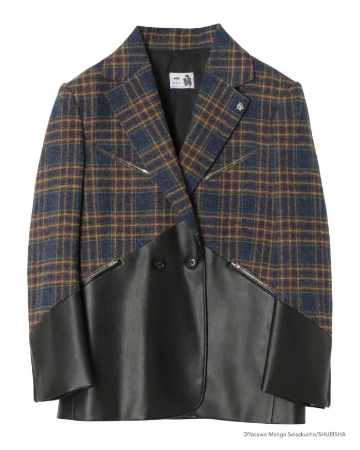 チェックとレザーの切り替えで、レンの強さと孤独を表現した構築的ジャケット。