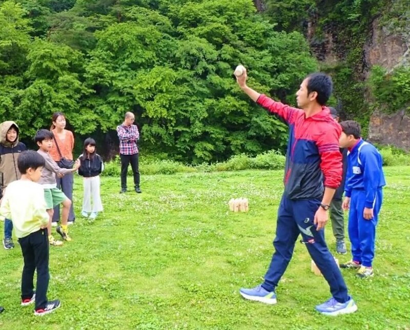 アウトドアスポーツを楽しむ会でモルックを実演してみせる鳴瀬望さん(写真右手前)鳴瀬さんは「地域おこし協力隊」として、「いつでも」「誰でも」「好きなレベルで」「世代を超えて」「いろいろなスポーツを」「いつまでも」楽しむことができる地域のスポーツコミュニティづくりを目指しているそうだ。そのためのキーワードは「つなぐ」。