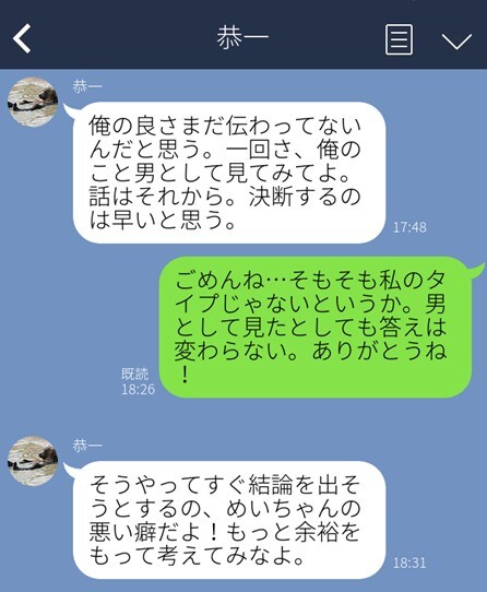 「恭一くんとは3カ月ほど前に知り合い、友達としてたまーにLINEをしていました。でもある日、LINEで付き合ってほしいと言われたんです。もちろん私は友達としてしか見てなかったので、お断りしました。