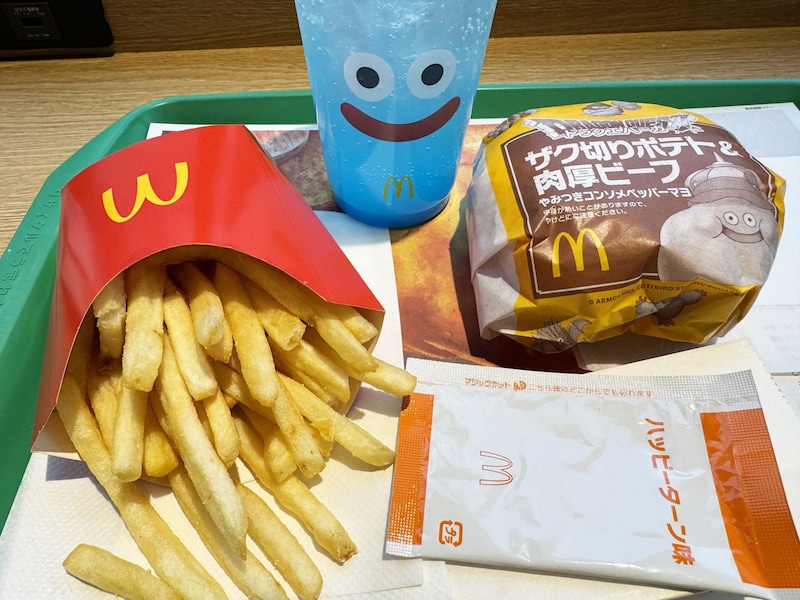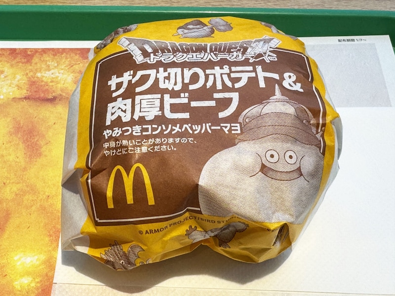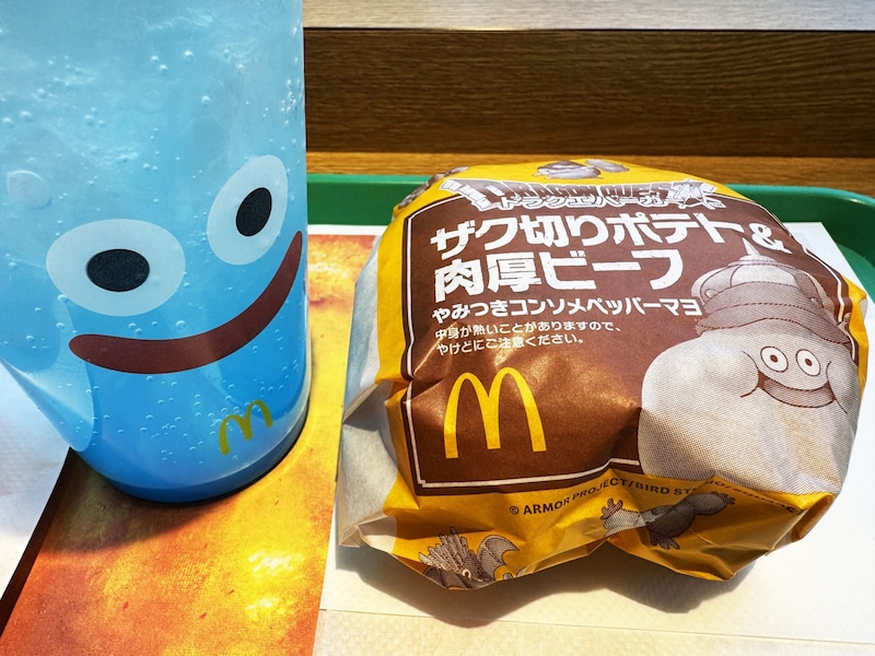 マクドナルドのドラクエバーガー「ザク切りポテト&肉厚ビーフ やみつきコンソメペッパーマヨ」を食べました。ドラクエ、つまり人気ゲーム「ドラゴンクエスト」シリーズとコラボレーションしたバーガーです。ピキー!