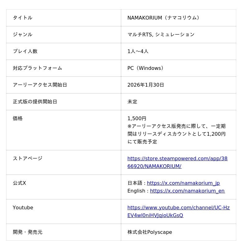 「未来を、前倒す。」をミッションとする株式会社Polyscape(本社:東京都港区、代表取締役:島田寛基、以下「当社」)は、日本時間の2026年1月30日に、海の掃除屋「ナマコ」が主役のカジュアルマルチプレイRTS「NAMAKORIUM(ナマコリウム)」のアーリーアクセス版の提供開始日を決定しました。なお、定価は1,500円を予定していますが、アーリーアクセス版の発売日から一定期間は、リリースディスカウントとして1,200円で販売することも合わせて決定しました。