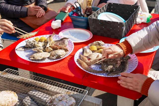 厳選された約10種の日本酒から好きな銘柄を選び、1杯300円で堪能できる「地酒の飲みくらべ」は「泉南牡蠣まつり」の名物イベント。熱燗でもいただける日本酒を片手に、牡蠣とのマリアージュを楽しんで。