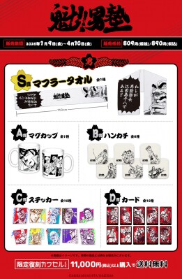 フィジカルグッズのオンラインくじ「カワセルくじ」にて、大好評を博しながらも限定期間での販売を終了した『魁!!男塾』のくじが、再販を要望するファンの声を受けて、待望の【復刻再販】です。