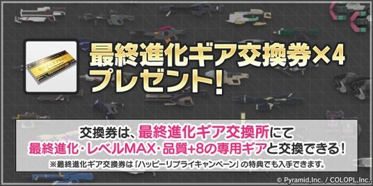 最大強化済みの専用ギアと交換することができる「最終進化ギア交換券」を、ゲーム内受取箱にプレゼントいたします。