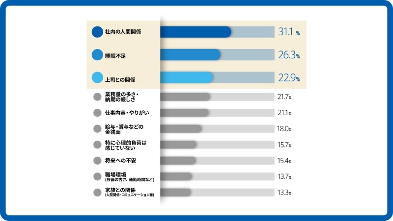 心理的な負担の中で、最も多く挙げられていたのは職場の人間関係です。同僚や上司、部下との関係性は、仕事をしていく以上、完全に切り離すことができません。合わない相手がいたとしても、距離を取るのが難しいのが職場という場所です。