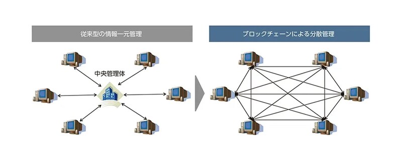 図3:従来型の中央一元管理とブロックチェーンによる分散管理のイメージ(出典:総務省「情報通信白書平成30年版」図表3-3-3-1)