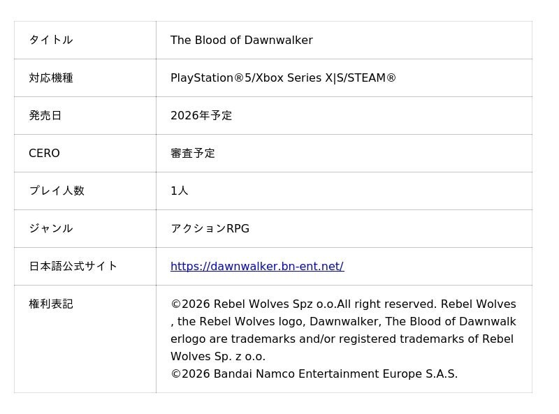 株式会社バンダイナムコエンターテインメントは、Rebel Wolvesが PlayStation5、STEAM、Xbox Series X|S向けに開発中の『The Blood of Dawnwalker』の新情報を含む最新トレーラー「Launch Year Special」を公開しました。