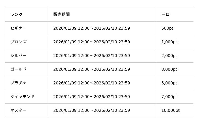 ※2026年1月8日12時時点でのランクが各ランクガチャの対象となります。期間中にランク昇格された場合も、対象ガチャとなったガチャを販売終了日まで引続きご利用いただけます。
