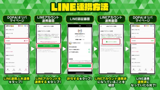 - DOPA! アプリ(https://dopa-game.jp/mobile)の『マイページ』にて、『LINE連携 連携済』で参加完了