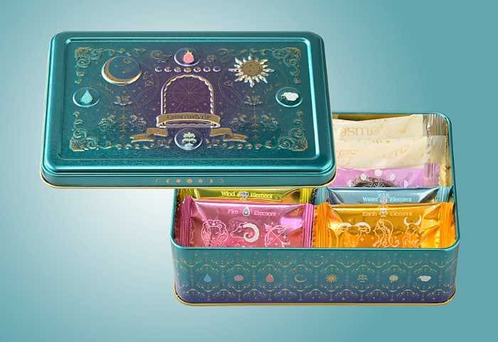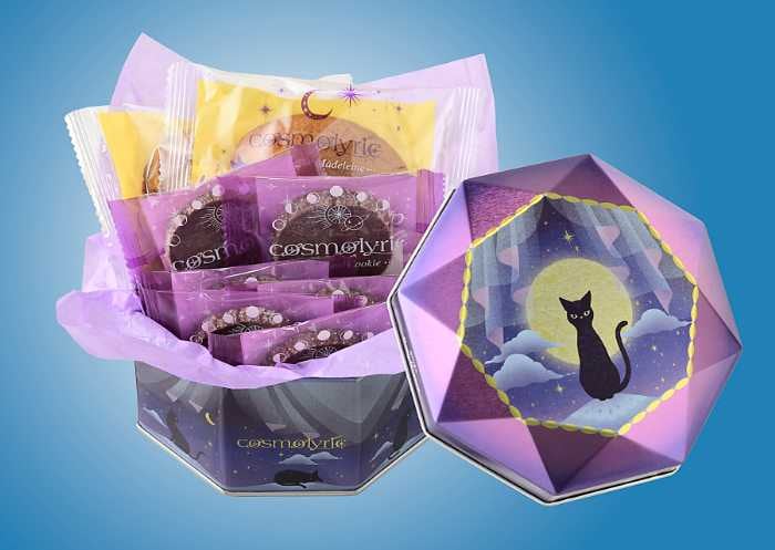「月とおまじない缶(10個入)」は1,500円(税込1,620円)。エレメントや星座、月と太陽の関係性を描いたデザイン缶に、焼菓子4種をアソート。