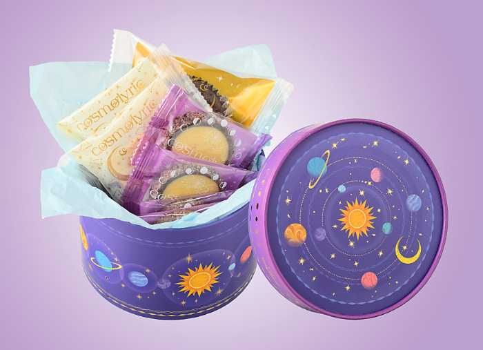 「月と惑星BOX(7個入)」は価格1,100円(税込1,188円)。月の満ち欠けと星座を描いた筒形ボックスに、焼菓子3種をアソートし、宇宙(ソラ)からのメッセージカード付きです。