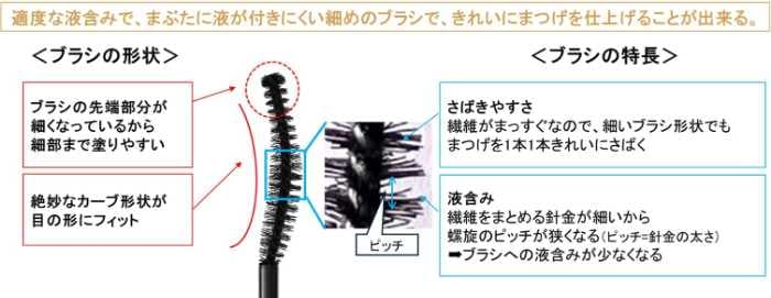 繊維フリーのふんわり軽い中味液と、目のカーブにフィットする「ムーンスリムブラシ」を採用。ダマになりにくく、細部まで塗りやすいため、一本一本セパレートした上品な美ロングまつ毛に仕上がります。