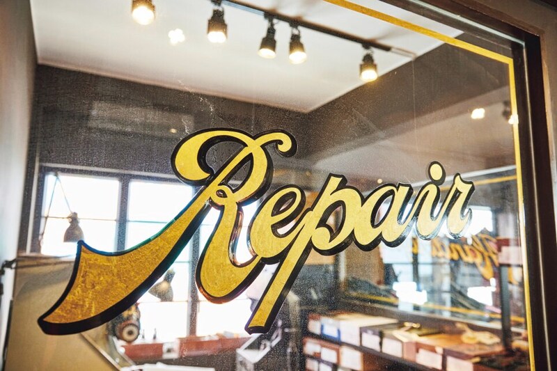 店内のサインもクラシックなレタリングワークで統一されている。作業室のサインもゴールドリーフを使った見事なデザイン。ヘリテージスタイルは細部にまで徹底されている。