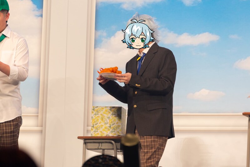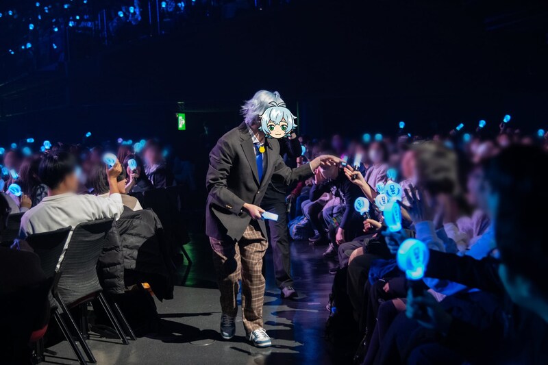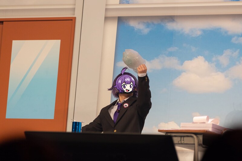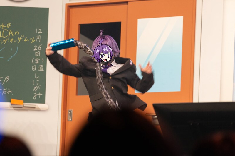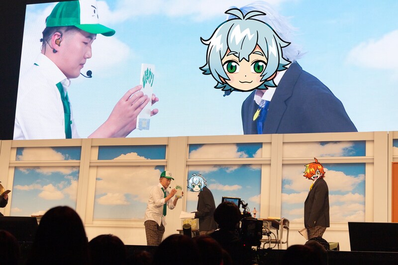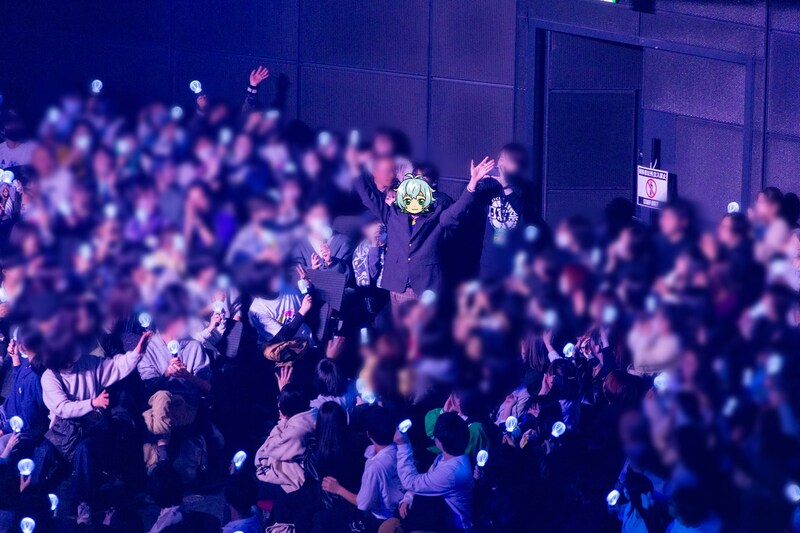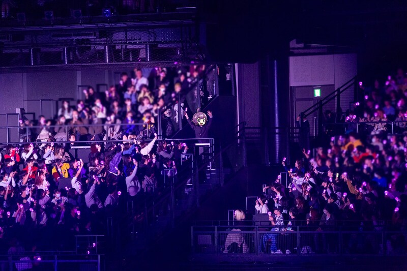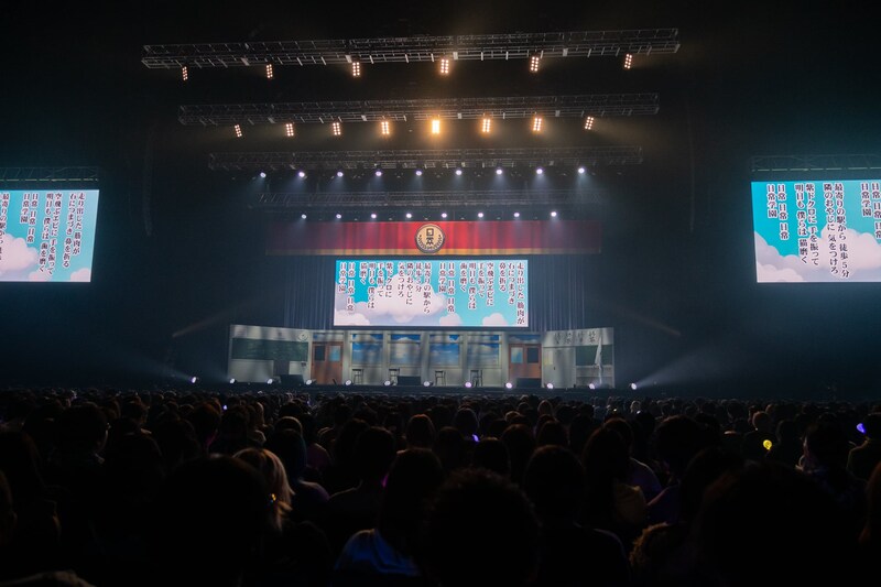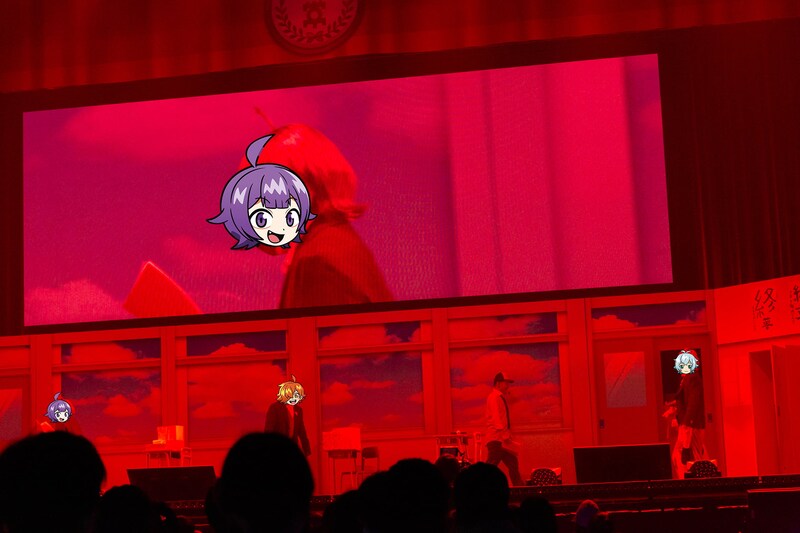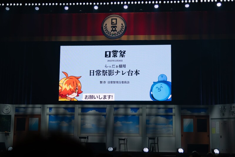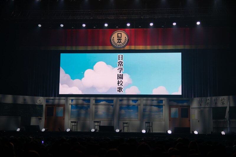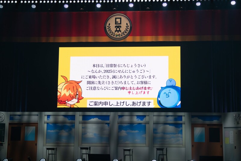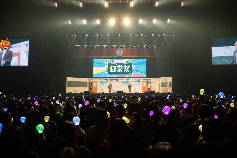 注意事項の読み上げがスタートすると、会場の期待感が高まっていく。日常組メンバーのぺいんとと、人気実況者・らっだぁによるユルいかけ合いによるアナウンスは、「ご案内申し上しあげます」や「お楽ししみください」など、スタッフによる台本のミス(罠?!)も連発で、会場の空気がほぐれていく。パート締めくくりにはメンバー4人による「日常学園校歌」が斉唱された。