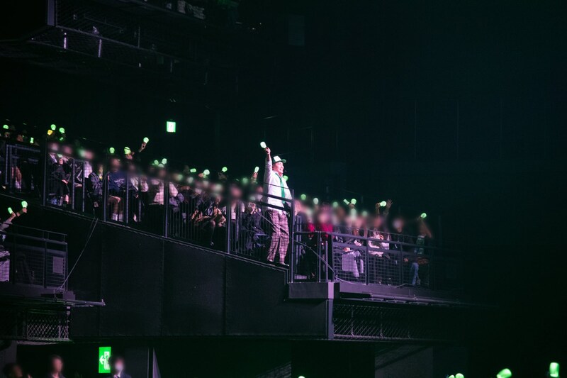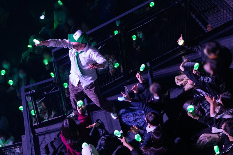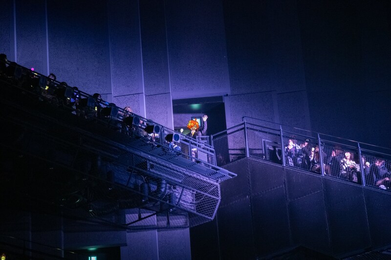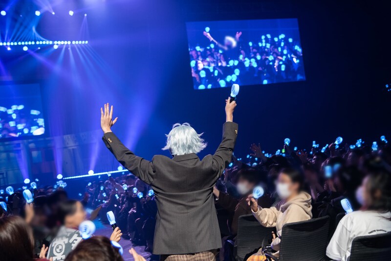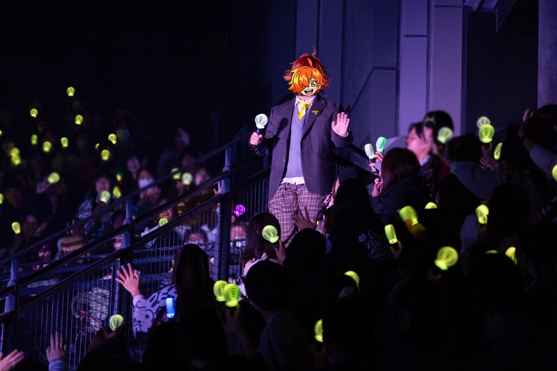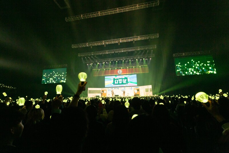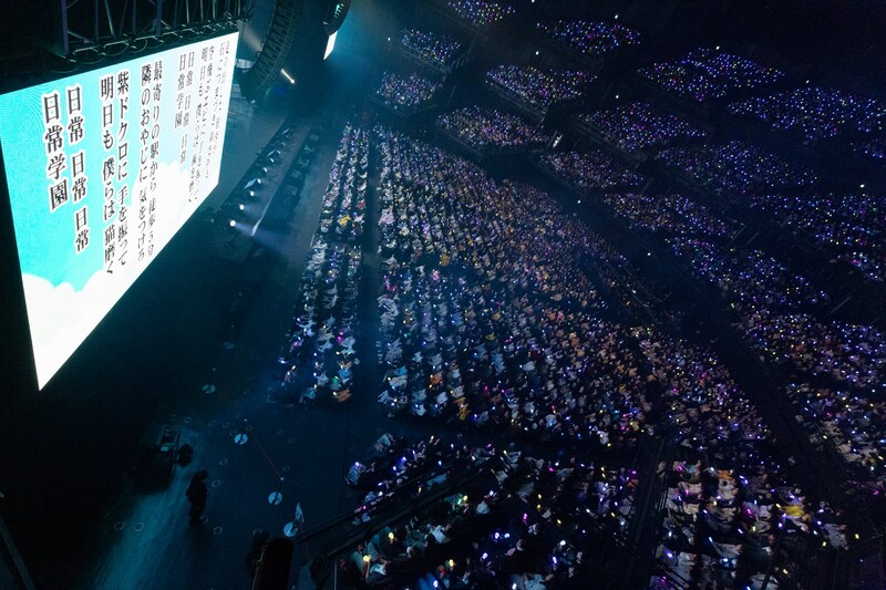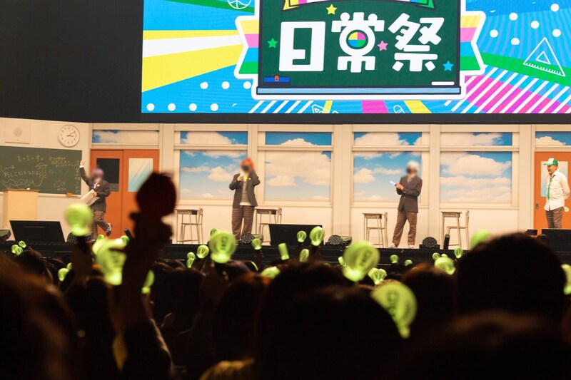 コールアンドレスポンスでは「日常祭、楽しむ準備できてるかーい!?」(トラゾー)、「クロノアのファンの人ー!」(クロノア)、「男子ー! 女子ー! トラゾー!」(ぺいんと)とそれぞれのかけ合いが展開する。そして最後はしにがみが「ボルダリ!」と叫んで「ング!」を客に叫ばせるという高難易度コール&レスポンスも見事に決まると、観客のペンライトがそれぞれのメンバーカラーで客席を彩った。日常組初となる学園祭の幕開けだ。