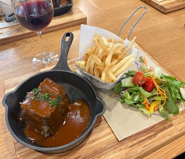 この日のメインは「テキサス風 BBQ ショートリブ煮込み」。手作りスパイスで味を重ねた骨付き肉を、表面を軽く焼き、パプリカとタマネギを効かせた特製BBQソースで5時間じっくりと煮込んだ贅沢な一皿。ほろりと崩れるやわらかな肉と濃厚なソースは、まさにアメリカン・ダイニングの醍醐味です。