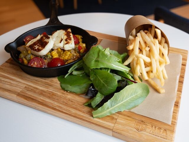 野菜料理では、パプリカ、コーン、トマトを香ばしくソテーし、グリルしたハルーミチーズをトッピングした「キャンプファイヤー・ベジタブルサコタッシュと焼きハルーミチーズ」がスタンバイ。