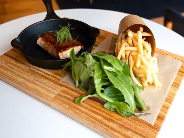 魚料理では、「ブラウンシュガー&バーボンソースのアトランティックサーモン」を提供。サーモンを香ばしく焼き上げ、ブラウンシュガーとケンタッキーバーボン、カイエンペッパーの甘辛テイストのグレーズで仕上げた一品です。