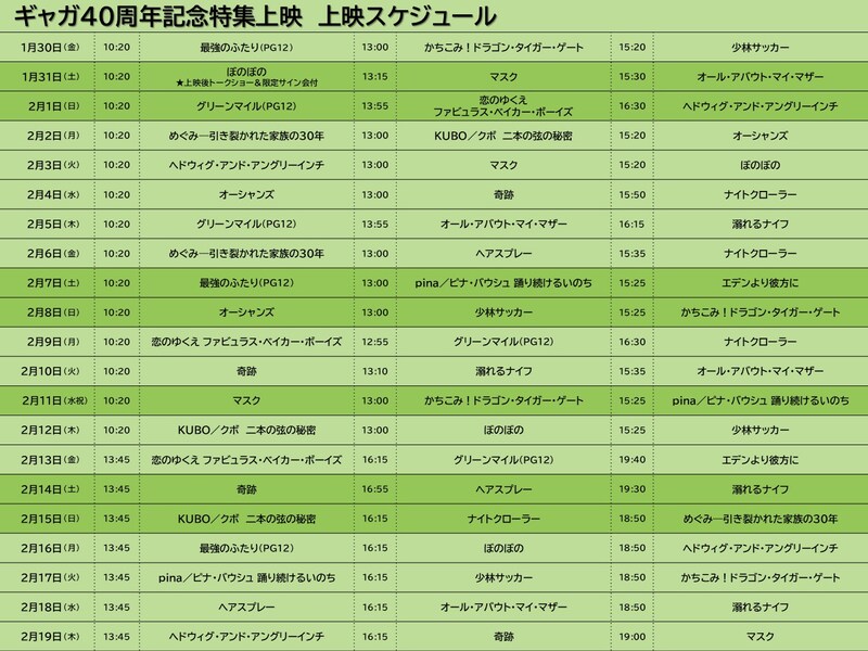 『恋のゆくえ ファビュラス・ベイカー・ボーイズ』Images courtesy of Park Circus/Itv Studios,『ぼのぼの』© 1993いがらしみきお/“ぼのぼの”映画製作実行委員会,『マスク』Images courtesy of Park Circus/Warner Bros.,『グリーンマイル』Images courtesy of Park Circus/Warner Bros.,『オール・アバウト・マイ・マザー』Images courtesy of Park Circus/Pathe,『ヘドウィグ・アンド・アングリーインチ』Images courtesy of Park Circus/Warner Bros.,『少林サッカー』Images courtesy of Park Circus/Paramount,『エデンより彼方に』©2002 FOCUS FEATURES,LLC.ALL RIGHTS RESERVED.,『めぐみ 引き裂かれた家族の30年』©Safari media LLC 2006,『かちこみ!ドラゴン・タイガー・ゲート』©2006 Mandarin Films Ltd. All Rights Reserved.,『ヘアスプレー』Images courtesy of Park Circus/Warner Bros.,『オーシャンズ』© 2009 Galatée Films – Pathé – France 2 Cinéma – France 3 Cinéma – Notro Films – JMH-TSR,『奇跡』©2011「奇跡」製作委員会,『Pina /ピナ・バウシュ 踊り続けるいのち』© 2010 NEUE ROAD MOVIES GMBH, EUROWIDE FILM PRODUCTION,『最強のふたり』© 2011 SPLENDIDO / GAUMONT / TF1 FILMS PRODUCTION / TEN FILMS / CHAOCORP,『ナイトクローラー』© 2013 BOLD FILMS PRODUCTIONS, LLC. ALL RIGHTS RESERVED.,『溺れるナイフ』©ジョージ朝倉/講談社 ©2016「溺れるナイフ」製作委員会,『KUBO/クボ 二本の弦の秘密』©2016 TWO STRINGS, LLC. All Rights Reserved.
