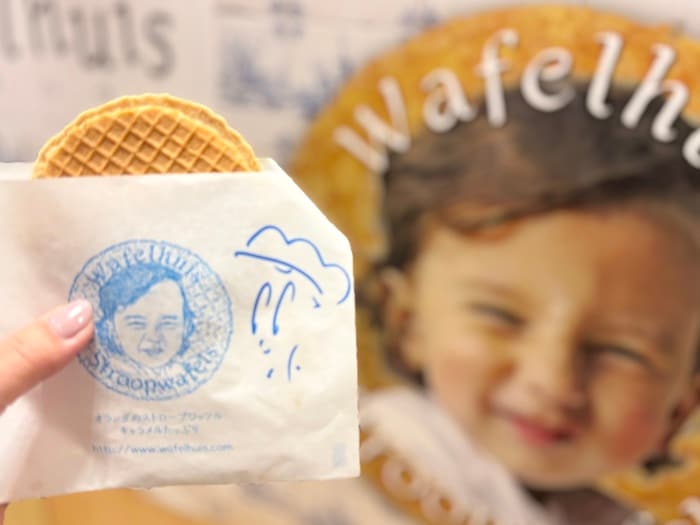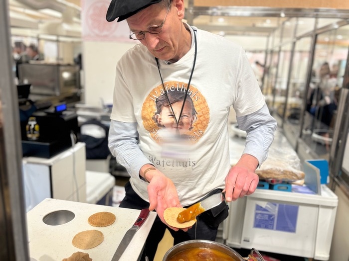 生地もキャラメルも全部手作り!生地から焼き上げるストロープワッフル。普段目にするストロープワッフルは硬いのですが、こちらは焼きたてなのでフニャフニャで、中にはたっぷりの濃厚なシナモンキャラメルをサンド。表面サクッととろけるような食感。