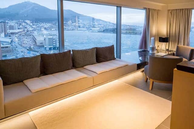 87平米の「ロイヤルスイート」は13階にあるコーナールームで、窓が広く函館山や金森赤レンガ倉庫、函館湾の景色を一望できる客室です。特に2024年に大ヒットを記録したアニメ映画にも登場。シモンズとコラボしたオリジナルベッドは幅160cm × 長さ203cm が2台置かれ定員は2名です。